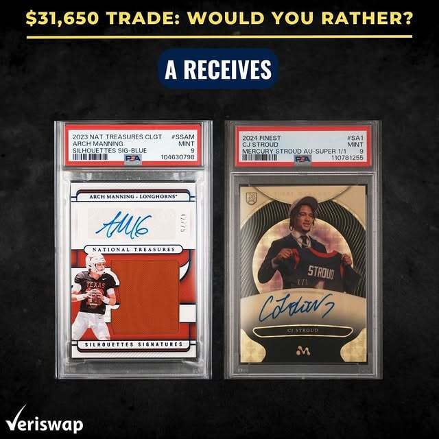 Arch Manning NT Blue /75 + CJ Stroud 1/1 vs. Dual NFL Shields 1/1 + Penix Gold + Skenes — $31.65K Trade. In this $31,650 deal, Side A packaged a 2023 National Treasures Collegiate Arch Manning Silhouettes Signatures Blue /75 PSA 9 and a 2024 Finest CJ Stroud Mercury Auto Superfractor 1/1 PSA 9, while Side B countered with a 2020 Panini Immaculate Collection Joe Thomas/Joe Staley Dual NFL Shields 1/1 PSA 8.5, 2024 Prizm Michael Penix Jr. Gold Shimmer PSA 10, and 2023 Topps Chrome Paul Skenes Auto Blue RayWave /150.