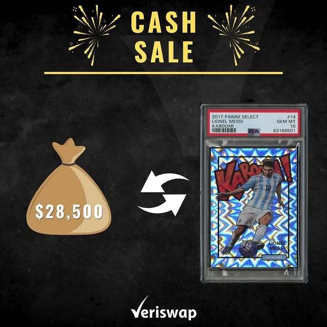 Messi Kaboom PSA 10 — $28,500 Cash Sale. A 2017 Panini Select Lionel Messi Kaboom! PSA 10 moved in a straight $28,500 cash deal, a strong mark for one of the hobby’s most electric inserts featuring the global GOAT.