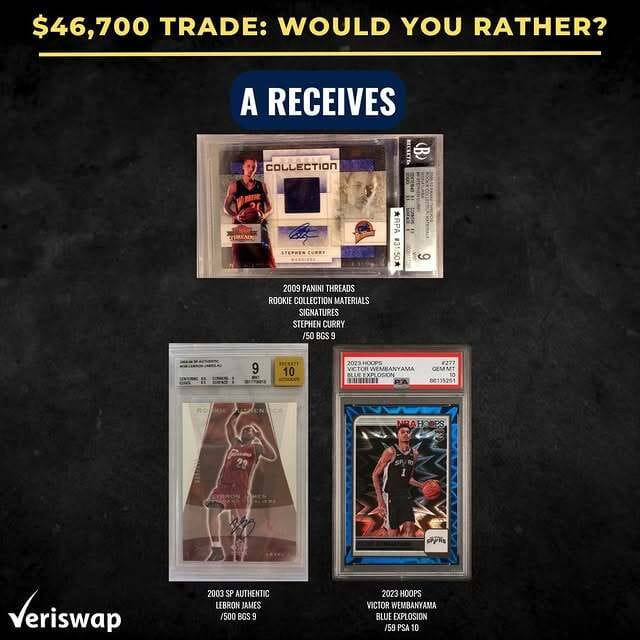 Curry RC Auto + LeBron SP Authentic + Wemby /59 vs. MJ Rookie BGS 9 + UNC Letterman — $46.7K Trade. In this $46,700 deal, Side A assembled a 2009 Panini Threads Rookie Collection Materials Signatures Stephen Curry /50 BGS 9, 2003 SP Authentic LeBron James /500 BGS 9, and 2023 Hoops Victor Wembanyama Blue Explosion /59 PSA 10, while Side B moved a 1986 Fleer Michael Jordan /132 BGS 9 and a 2012 Upper Deck Jordan UNC Master Collection Letterman /5 BGS 9.
